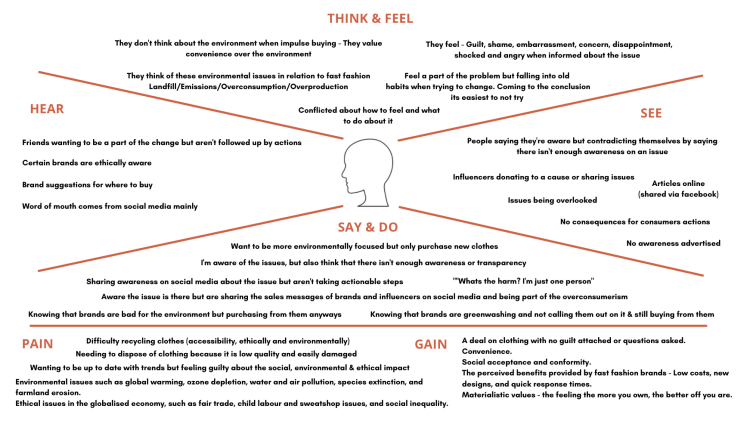 - The empathy and define stages of our project provided us with the insight that Gen Z and younger Millennials were the group most interested in becoming conscious consumers; and we believed by helping them transform their purchasing habits, we could also help with the global textile crisis.