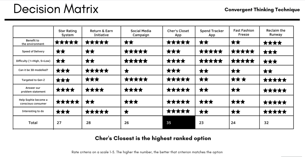 With 7 options to choose from and time ticking down, we needed to converge and find a hero solution to move forward into the prototype phase of our project. To do this we created a decision matrix and rated our ideas based on a criterion: