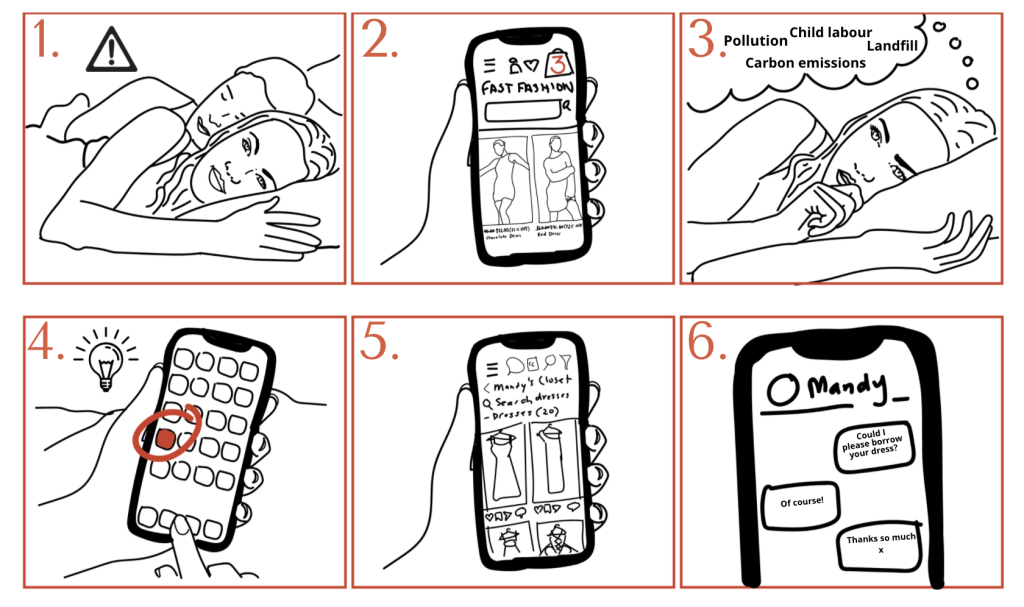 What is it?: A storyboarded scenario of a target audience member “Sophie” using the “borrow an item function” of the Conscious Closet App.